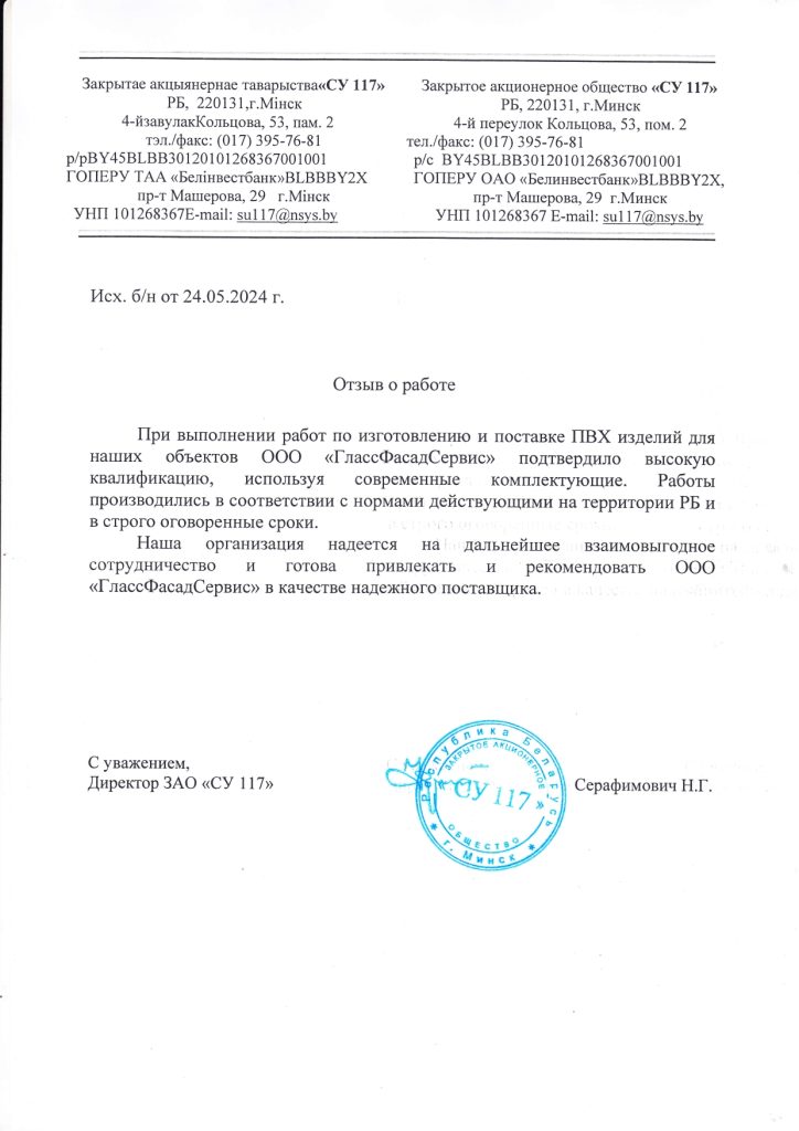 Отзыв о ГлассФасадСервис 2024г. СУ 117