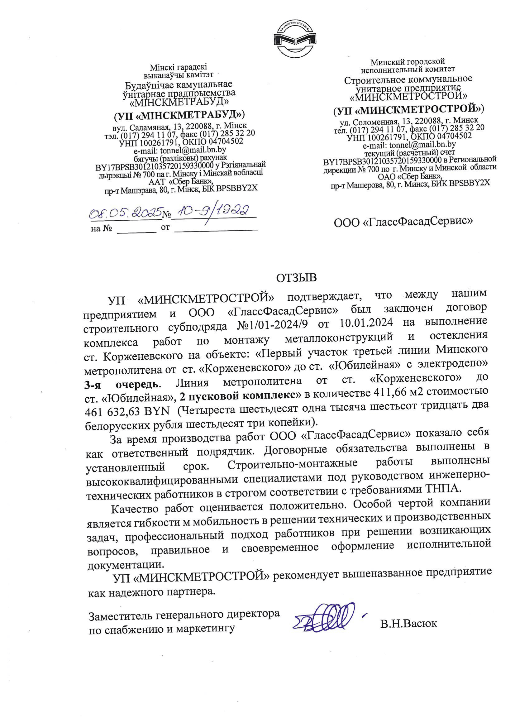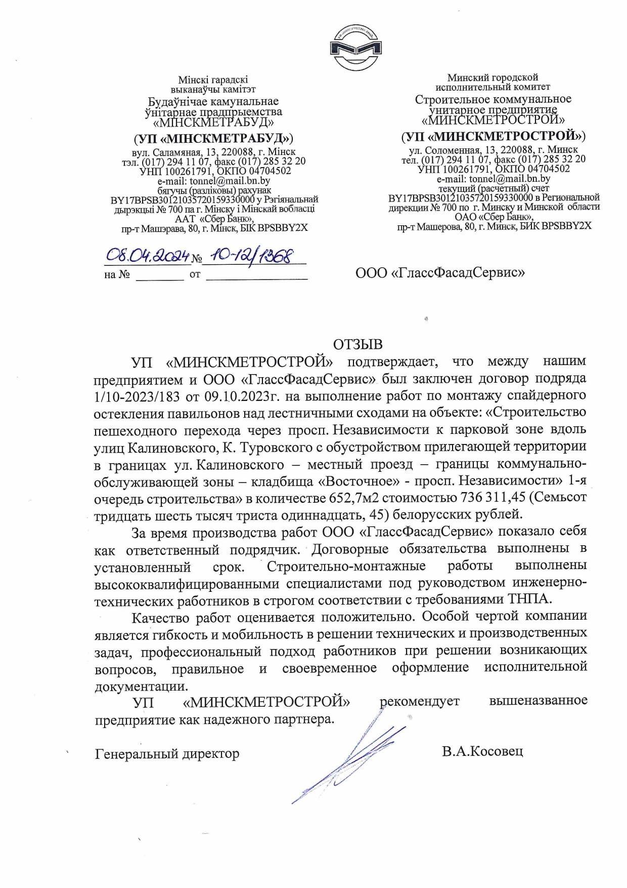 Отзыв о ГлассФасадСервис 2025 Минскметрострой Корженевского