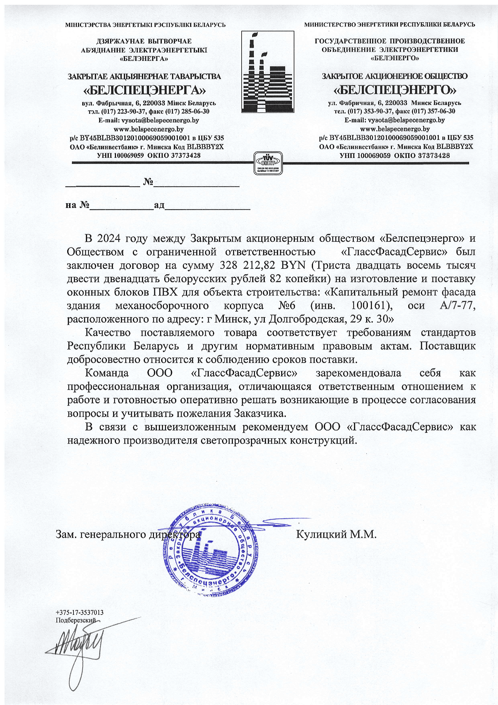 Отзыв о ГлассФасадСервис 2024г. Белспецэнерго производственный корпус Долгобродская