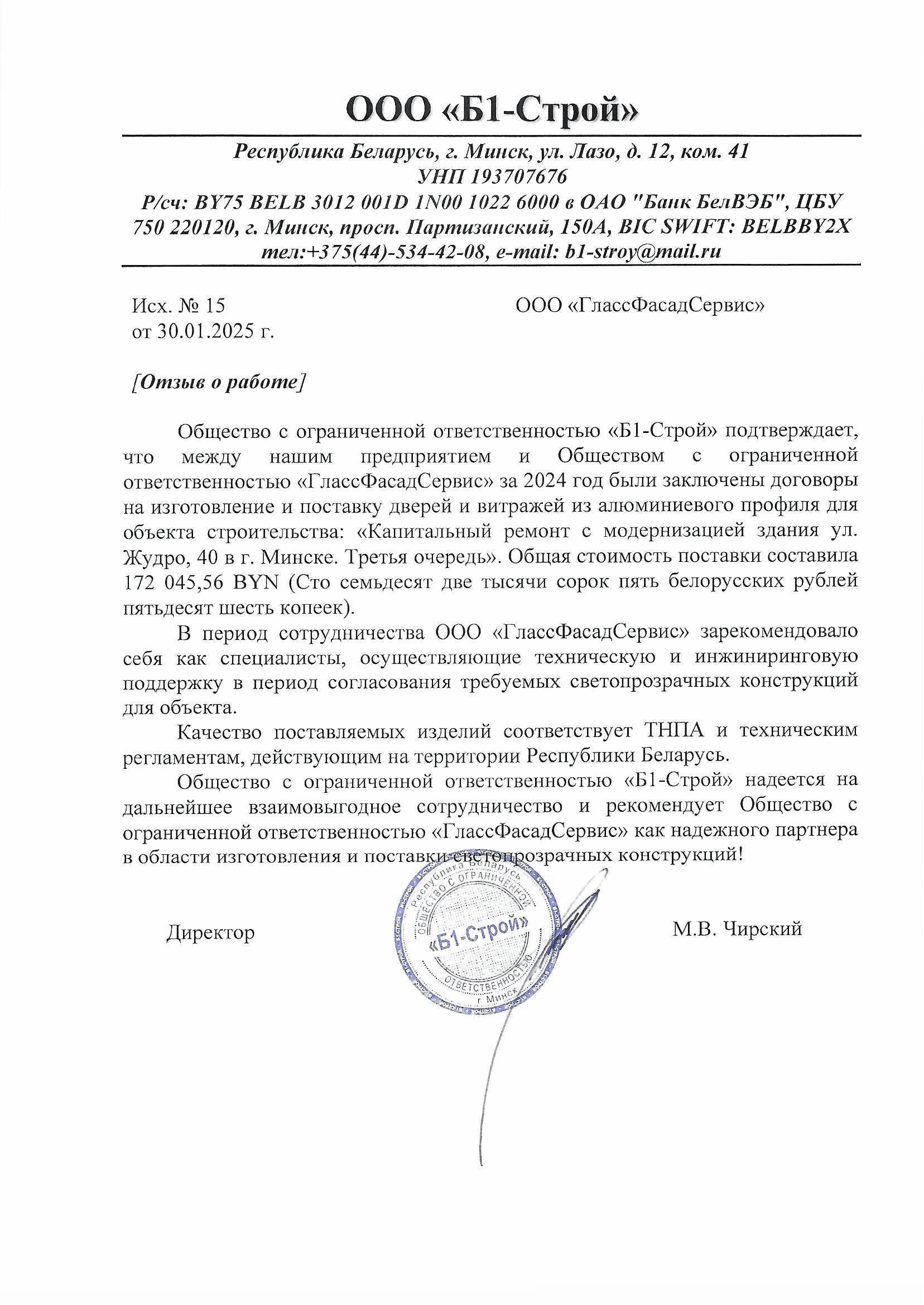 Отзыв о ГлассФасадСервис 2025г. Б1-Строй Жудро