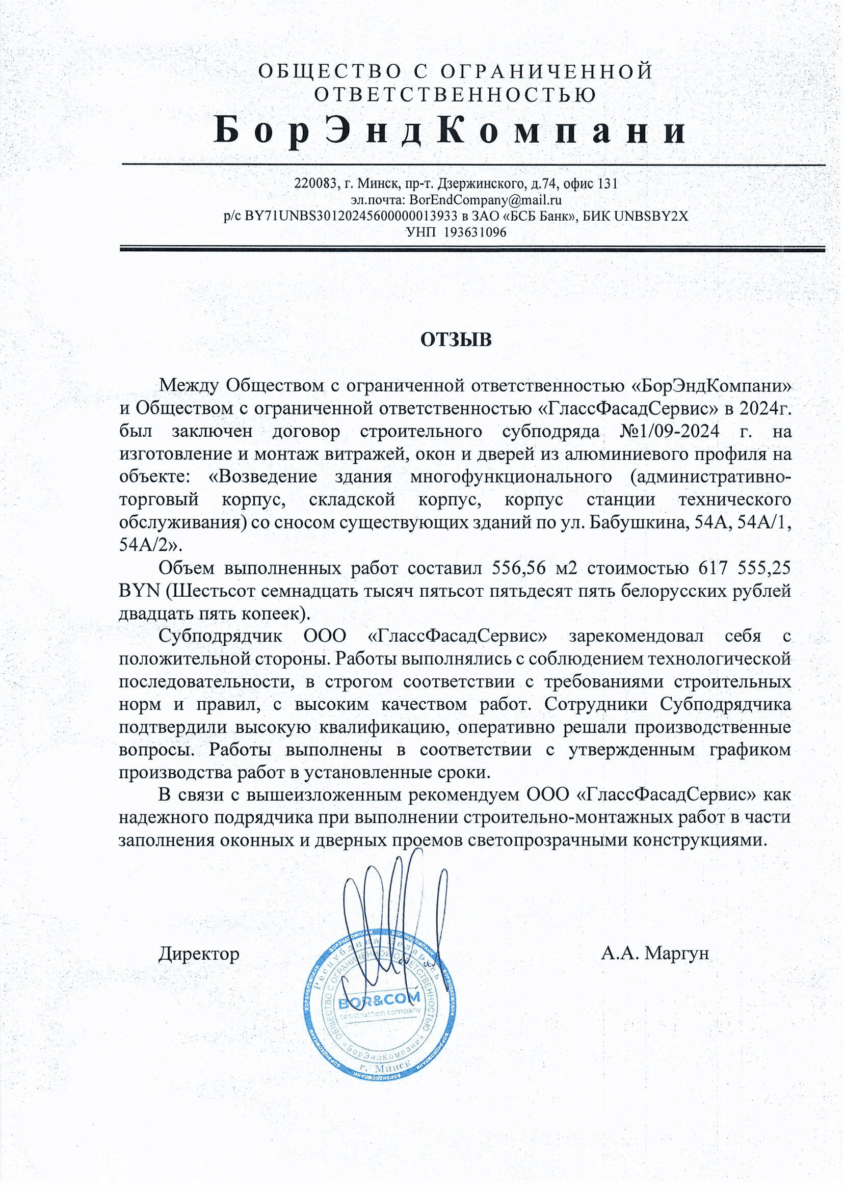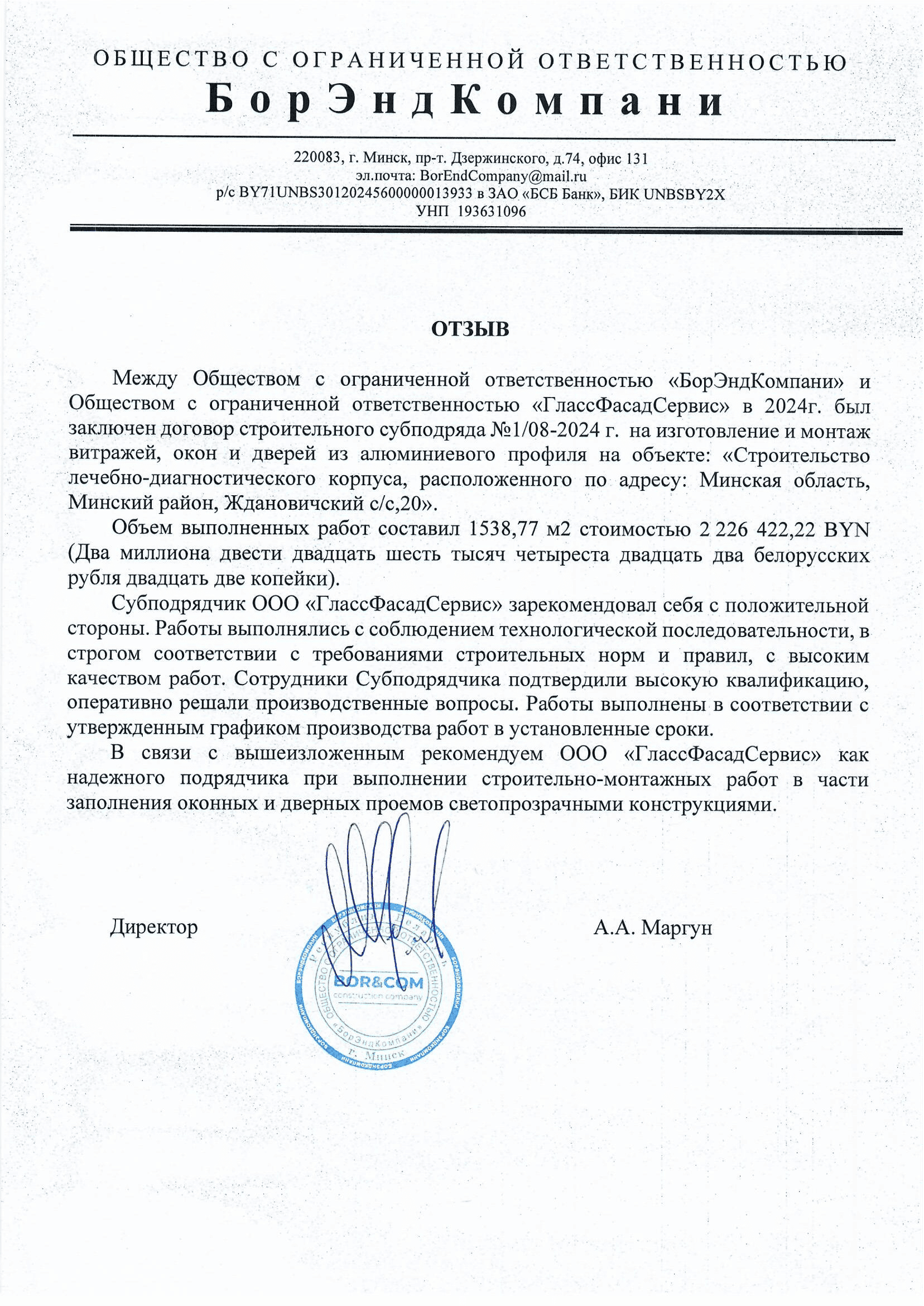 Отзыв о ГлассФасадСервис 2024г. Минскоблсельстрой