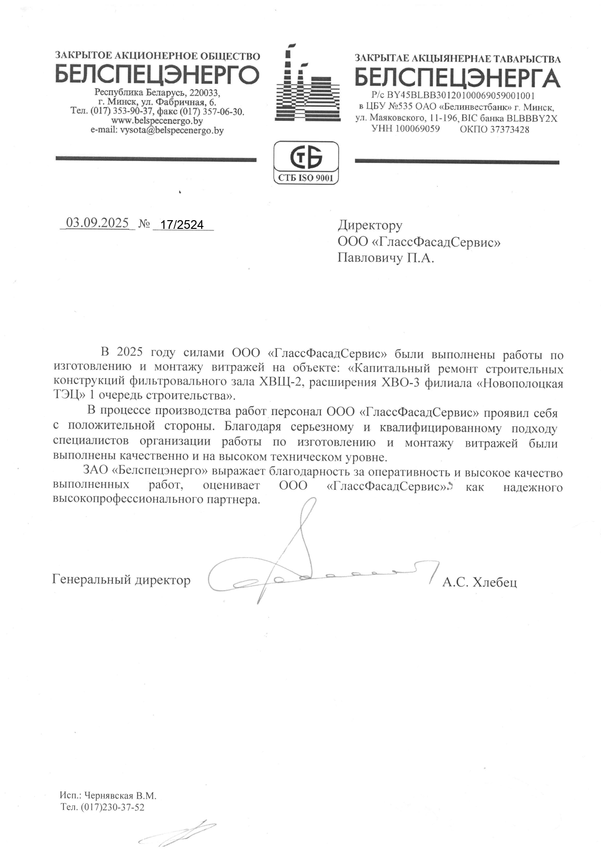Отзыв о ГлассФасадСервис - от БелСпецЭнерго по изготовлению и монтажу витражей из алюминиевого профиля на объекте Новополоцкая ТЭЦ 2025г